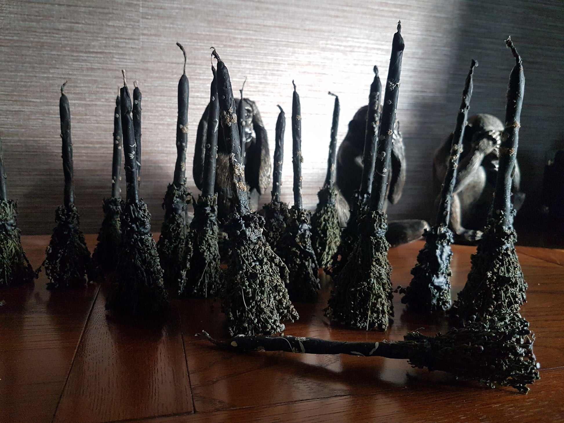 Black beewax Candle with wormwood. Black broomstick.